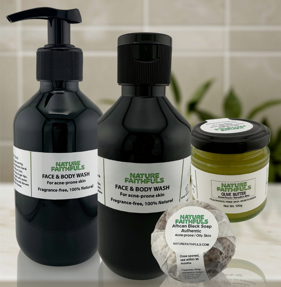 Nature Faithfuls Skincare Combo Pack (Full set) 1 x Face & Body Wash; 1 x African Black Soap; 1 x Olive Butter) is a discounted set, for a full experience of our natural skincare products.
