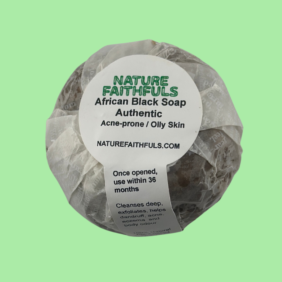 Nature Faithfuls African Black Soap is a 100 % plant-based cleansing bar, thoughtfully handcrafted to purify, exfoliate, and restore balance. This soap is ideal for those who want a deeply cleansing yet gentle option (especially for acne-prone, oily, or blemished skin) without synthetic additives or harsh chemicals.